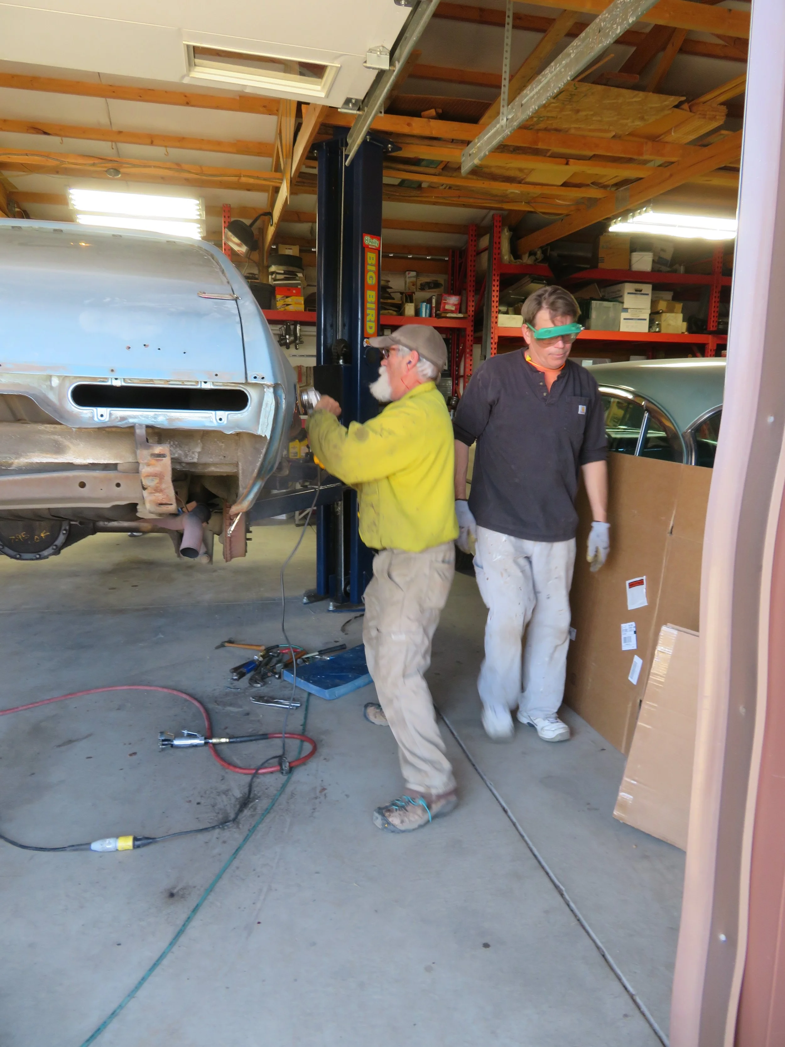 Progress was made on rear fender openings front clip has been primed. All interior out, along with steering wheel, to repair cracks in it. While moving the car to the lift, President Larry was trying to steer it with vise grips when it hit the shift lever and knocks it from reverse to drive, the sudden change of direction knocks Larry off the basket he was setting on, in to the back seat area. He regains his balance in time to shove it in park before it hit the garage.